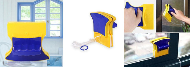 Double Sider Glass Cleaner – є двома накладками з магнітами та поверхнею, що чистять, які мають зручну ручку і мотузку на них для можливості одночасного двостороннього миття вікон. Правда миття вікон таким способом може проводитися тільки на одношарових вікнах.