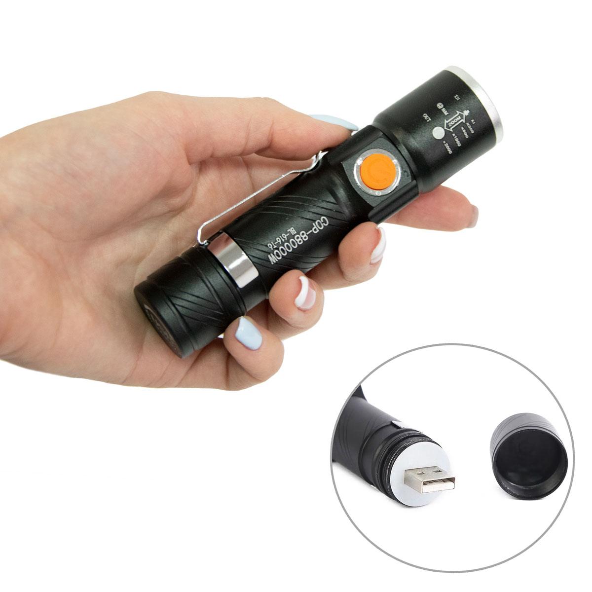 Zoom (масштабування) від 1х до 2000х проводиться легким рухом однієї руки. Фокус променя змінюється висуванням головної частини ліхтаря. Фокусна лінза дає можливість змінювати кут розсіювання світла від широкої плями до вузькоспрямованого променя. Ліхтар працює на потужному вбудованому літій-іонному акумуляторі. Заряджайте акумулятор за допомогою USB адаптера на пристрої.